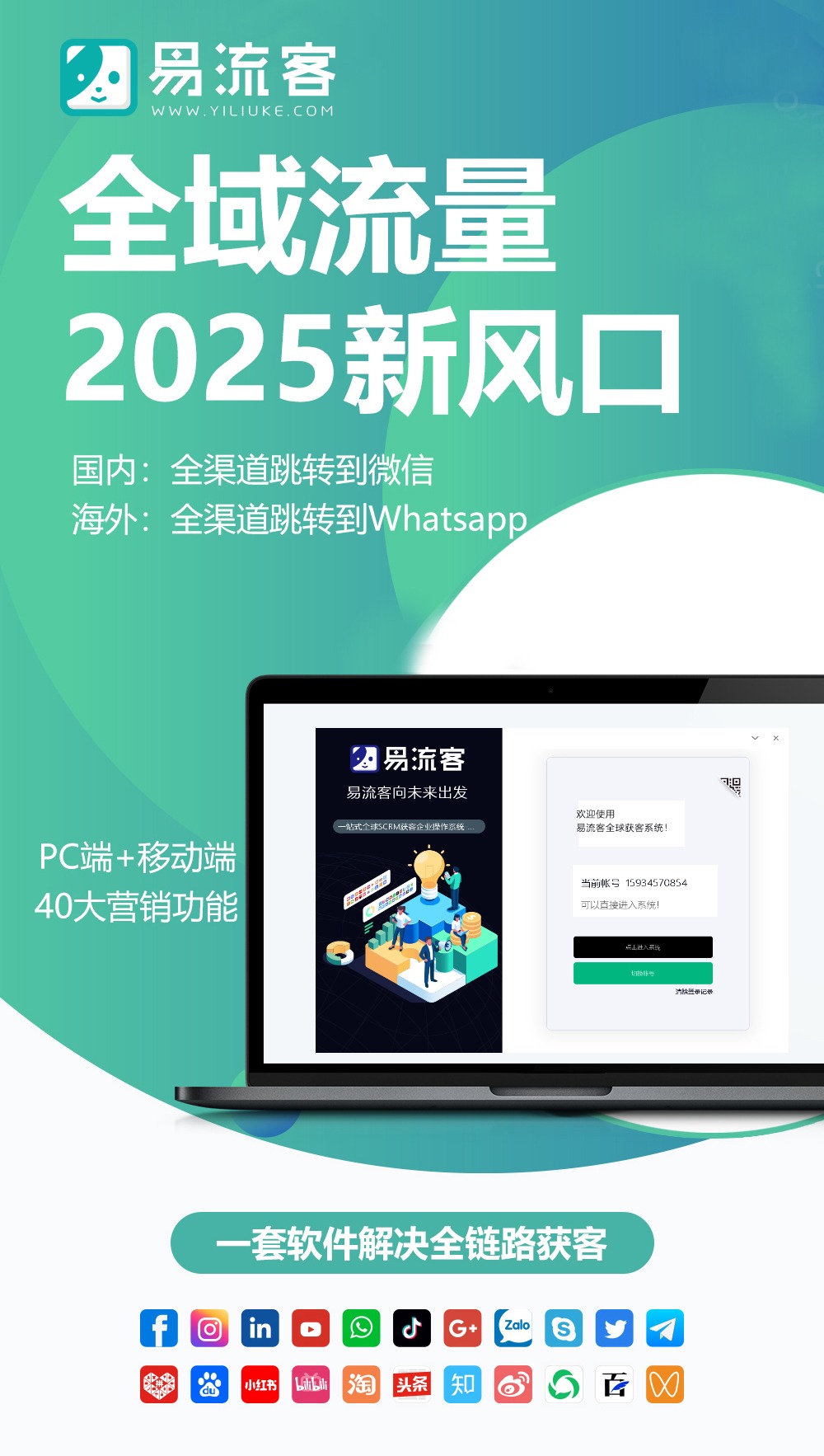 易流客全球獲客系統(tǒng)為企業(yè)在數(shù)字化時(shí)代的客戶獲取提供了全面支持和創(chuàng)新。選擇易流客系統(tǒng),選擇更高效、更智能的客戶獲取方式,助力企業(yè)在激烈競爭中脫穎而出,共同開創(chuàng)數(shù)字化時(shí)代的客戶獲取新篇章!www.yiliuke.108