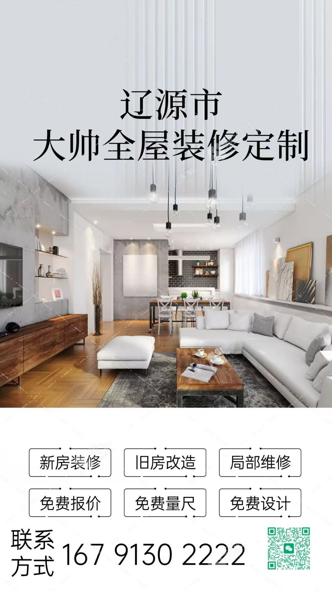 大帥??全屋定制裝修 新房裝修??舊房改造?? 輕工輔料??商裝公裝?? 局部維修??各種人工?? 民房翻新??全屋定制?? 免費(fèi)量房??免費(fèi)設(shè)計(jì)??免費(fèi)出圖?? 絕對(duì)沒(méi)有后期收費(fèi)??????? 絕對(duì)沒(méi)有施工暗坑?????? 每戶監(jiān)督到位????不趁心及時(shí)到位溝通???? ??全部主材可自選???全部人工可隨時(shí)調(diào)換 ??全部環(huán)節(jié)??定點(diǎn)驗(yàn)收??驗(yàn)收合格付款 ?????遼源市內(nèi)及周邊裝修就找大帥????? 電話???V信同步:16791302222