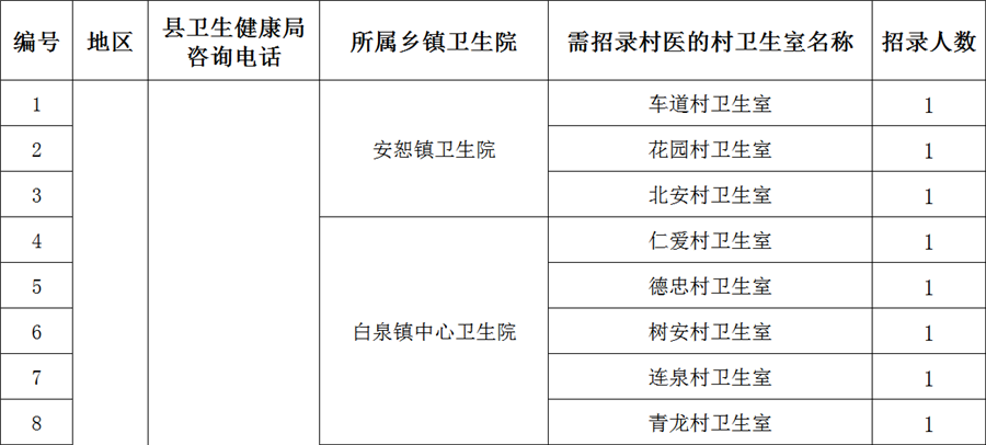 為進一步加強遼源市鄉(xiāng)村醫(yī)生隊伍建設,保障廣大農(nóng)村居民就近享有基本醫(yī)療和基本公共衛(wèi)生服務,依據(jù)《關于印發(fā)吉林省定向招錄鄉(xiāng)村醫(yī)生暫行辦法的通知》(吉衛(wèi)明電〔2020〕264號)規(guī)定,結(jié)合我市村衛(wèi)生室人員需求情況,現(xiàn)面向社會定向招錄鄉(xiāng)村醫(yī)生。現(xiàn)將有關事項通知如下:(一)定向招錄鄉(xiāng)村醫(yī)生要求年齡45周歲以下(以身份證為準),身體健康狀況適宜在村衛(wèi)生室工作,無《鄉(xiāng)村醫(yī)生從業(yè)管理條例》第十四條規(guī)定的情形,同時滿足下列條件之一:1、面向村衛(wèi)生室訂單定向免費培養(yǎng)醫(yī)學畢業(yè)生(含2020年畢業(yè)生)。2、取得國家承認的中等(含)以上醫(yī)學專業(yè)學歷畢業(yè)生(含2020年畢業(yè)生)。報考定向招錄鄉(xiāng)村醫(yī)生的醫(yī)學專業(yè)包括:臨床醫(yī)學(含農(nóng)村醫(yī)學)、麻醉學、醫(yī)學影像學、放射醫(yī)學、全科醫(yī)學、中醫(yī)學專業(yè)。不包括護理學類、口腔醫(yī)學類、管理類、預防醫(yī)學類、藥學類等專業(yè)。招聘崗位資格條件由各縣衛(wèi)健局審核。按照《吉林省定向招錄鄉(xiāng)村醫(yī)生暫行辦法》規(guī)定的條件,符合條件的報名考生可通過指定網(wǎng)址登錄(2020年定向招錄村醫(yī)報名系統(tǒng):https://cunyi.jljcws.com:8088/,擇時開通),開展網(wǎng)上報名,填寫相應的個人信息,選擇意向村衛(wèi)生室,并由個人對填報信息作出承諾(納入個人誠信體系)后,完成提交。5月13-22日。同時,報名考生可通過指定網(wǎng)址獲取相關工作進展通知和有關學習資料。(一)考試具體時間??荚嚂r間初步定于5月30日上午9:30-11:30(如有變動,通過報名系統(tǒng)另行通知)。(二)打印準考證。5月28-29日考生可通過報名網(wǎng)址在網(wǎng)上打印準考證,獲取考試時間和考試地點。(三)組織考試??忌凑諟士甲C確定的地點,到達指定考場進行考試(考生須佩戴口罩,接受體溫檢測合格后方可進入考場)。根據(jù)疫情防控要求,考生之間要適度保持距離。四、結(jié)果運用。(5月31日-6月10日)省衛(wèi)生健康委發(fā)布考試結(jié)果,市衛(wèi)生健康委按照“公開、平等、擇優(yōu)”的原則,確定招錄人選,并在官方媒體公示。 1.農(nóng)村醫(yī)學基礎診療知識。(約60分)2.基本公共衛(wèi)生服務項目規(guī)范(第三版)。(約30分)考生可通過網(wǎng)上下載第三版規(guī)范自行學習。有關考試信息及相關事項請注意查詢以下網(wǎng)站:遼源市衛(wèi)生健康委員會網(wǎng)址:http://wjw.liaoyuan.gov.cn/監(jiān)督舉報電話:遼源市衛(wèi)生健康委基層衛(wèi)生健康科 0437-6148859 附件:2020年遼源市定向招錄鄉(xiāng)村醫(yī)生需求明細表
